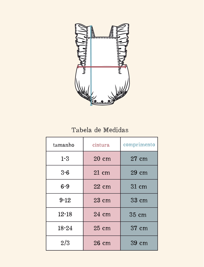 Apresenta elástico nas costas e na perninha para ajustar no corpo do bebê, além de três regulagens de altura da alça, com trava em botão de encaixe