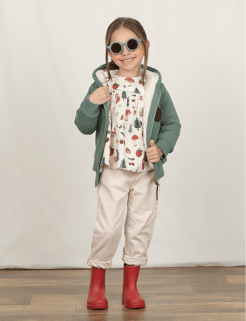 Blusa de mangas longas, com modelagem soltinha e confeccionada em tecido plano de algodão, que é fresquinho e garante a respirabilidade da pele das crianças. Tem elástico nas mangas, fechamento em botões nas costas e aplicação de babado frontal.