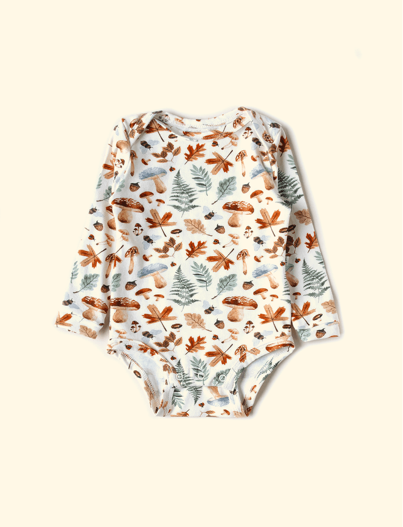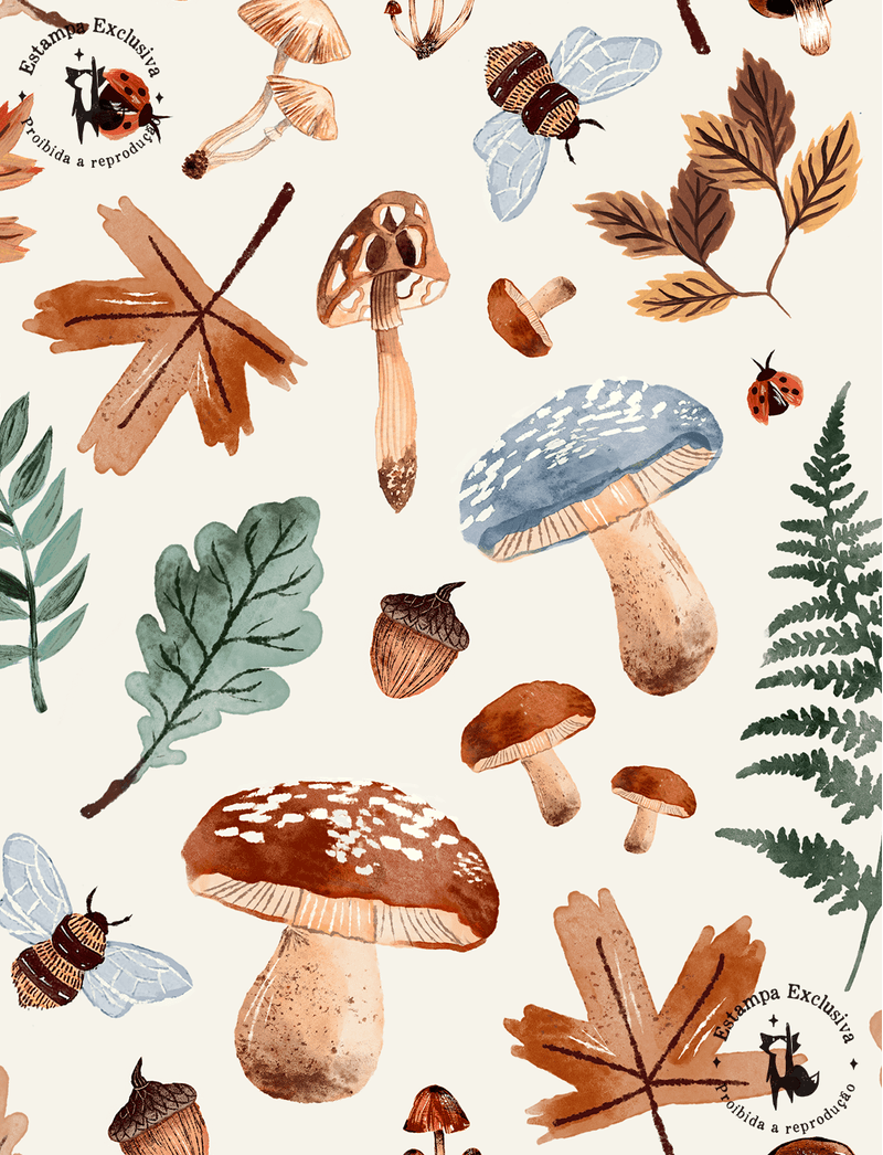 Trazendo o bosque da The Mini Forest no outono, essa estampa traz as folhas secas caídas e amareladas entre os cogumelos.