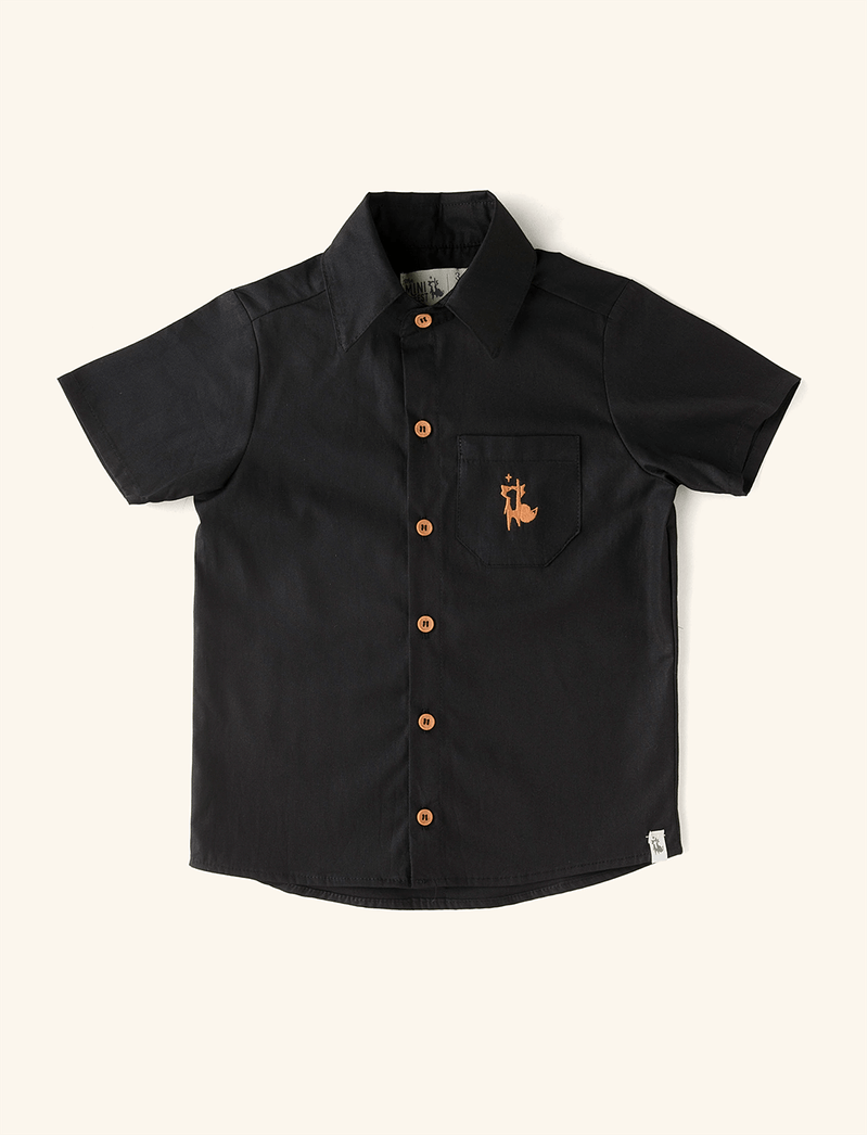 Camisa Unissex com mangas curtinhas e bolsinho no peito, confeccionada em tecido plano de algodão, que é respirável e fresquinho, perfeito para usar nos dias mais quentes. Tem fechamento na parte frontal, feito por botõezinhos, além de um bolsinho que é puro charme, com o bordado da raposinha mais amada da floresta.