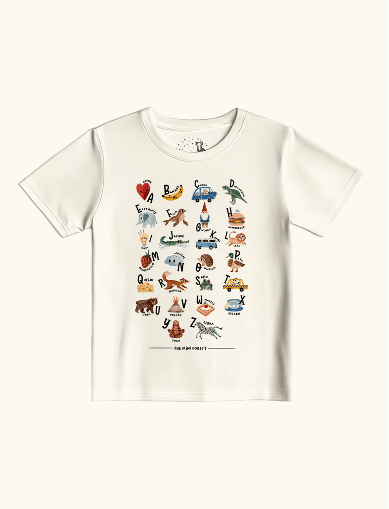 A estampa vem cheia de letrinhas, incentivando a criançada a aprender todo o alfabeto junto aos bichinhos e frutinhas mais amados dos bosques da The mini Forest.