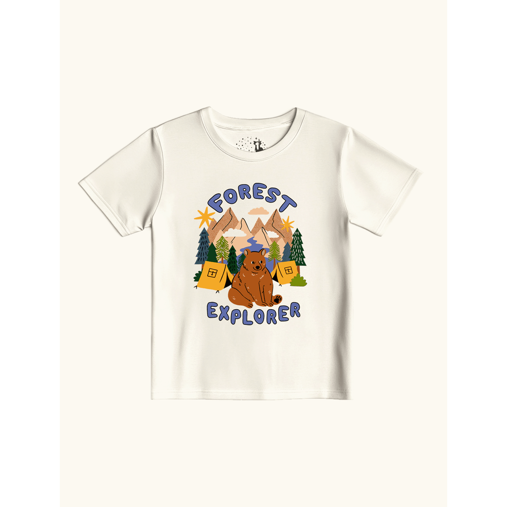 A estampa é localizada, com o senhor urso em acampamento e a frase "forest explorer".