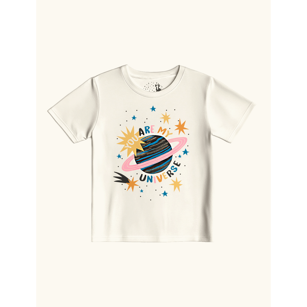 A estampa é localizada, com um o planeta e galáxia dos sonhos, além da frase "You are my universe".