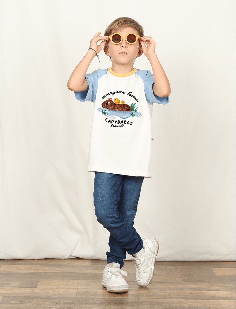 Essa peça The Mini Forest ainda tem modelagem raglan, com as manguinhas coloridas e estampa de capivarinha se refrescando à beira d'água.