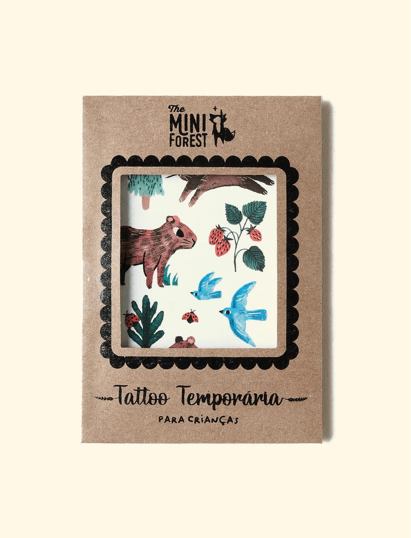Cartela de tatuagens temporárias The Mini Forest, feita com tinta atóxica e com certificação do Inmetro. Prontos pra inspirar a brincadeira com crianças e adultos, a The Mini Forest traz os personagens e estampas mais amados da nossa florestinha para a pele de todo mundo! Composição: Papel e tinta atóxica, não testado em animais.(monocalke, goma e BOPP) Validade: 16/12/2026 Dimensão da cartela: 10cm X 15cm Instruções de aplicação: Retire a proteção plástica e aplique o desenho desejado sobre a pele limpa e seca. Jogue água pelo verso e não mova o papel. Retire após 30 segundos. É muito importante seguir o passo a passo e não se mover para que a tattoo fique perfeita. Para remover utilize álcool em gel. Obs.: * Como, ao cortar a cartela, produzimos partes pequenas, esse produto não é indicado para crianças menores de 3 anos sem supervisão de um adulto. * As medidas podem variar em 5%. *Lembramos que o pedido mínimo no site é de R$ 40,00.