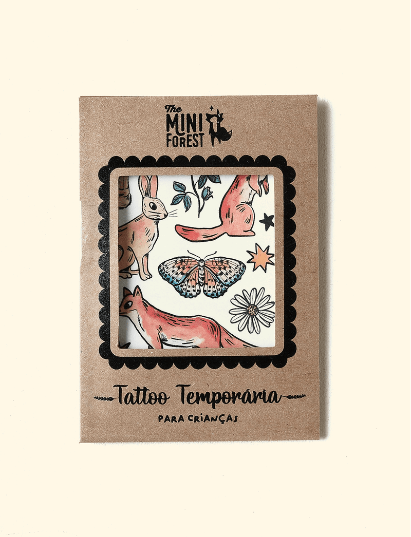 Cartela de tatuagens temporárias The Mini De Noite No Bosque, feita com tinta atóxica e com certificação do Inmetro.