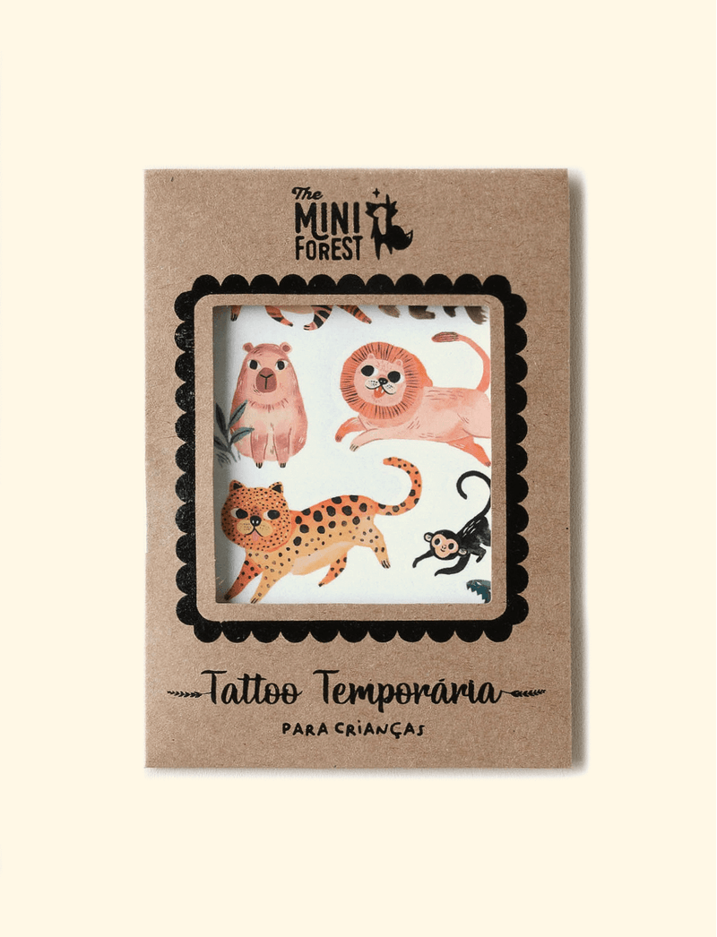 Cartela de tatuagens temporárias The Mini Fauna Feliz, feita com tinta atóxica e com certificação do Inmetro.