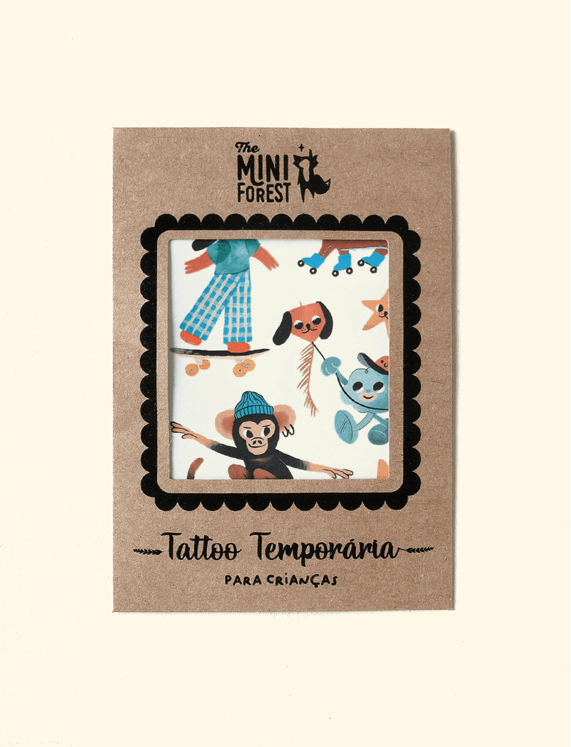 Cartela de tatuagens temporárias The Mini Férias, feita com tinta atóxica e com certificação do Inmetro.
