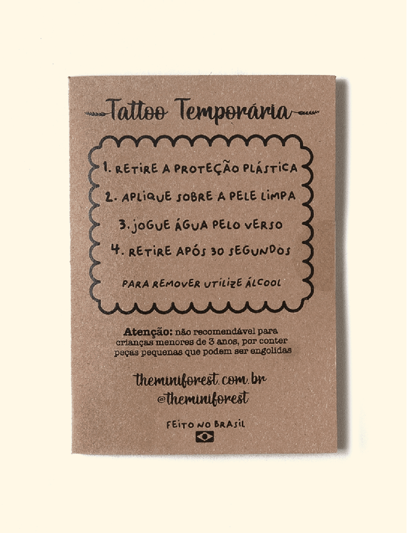 Instruções de aplicação: Retire a proteção plástica e aplique o desenho desejado sobre a pele limpa e seca. Jogue água pelo verso e não mova o papel. Retire após 30 segundos. É muito importante seguir o passo a passo e não se mover para que a tattoo fique perfeita.