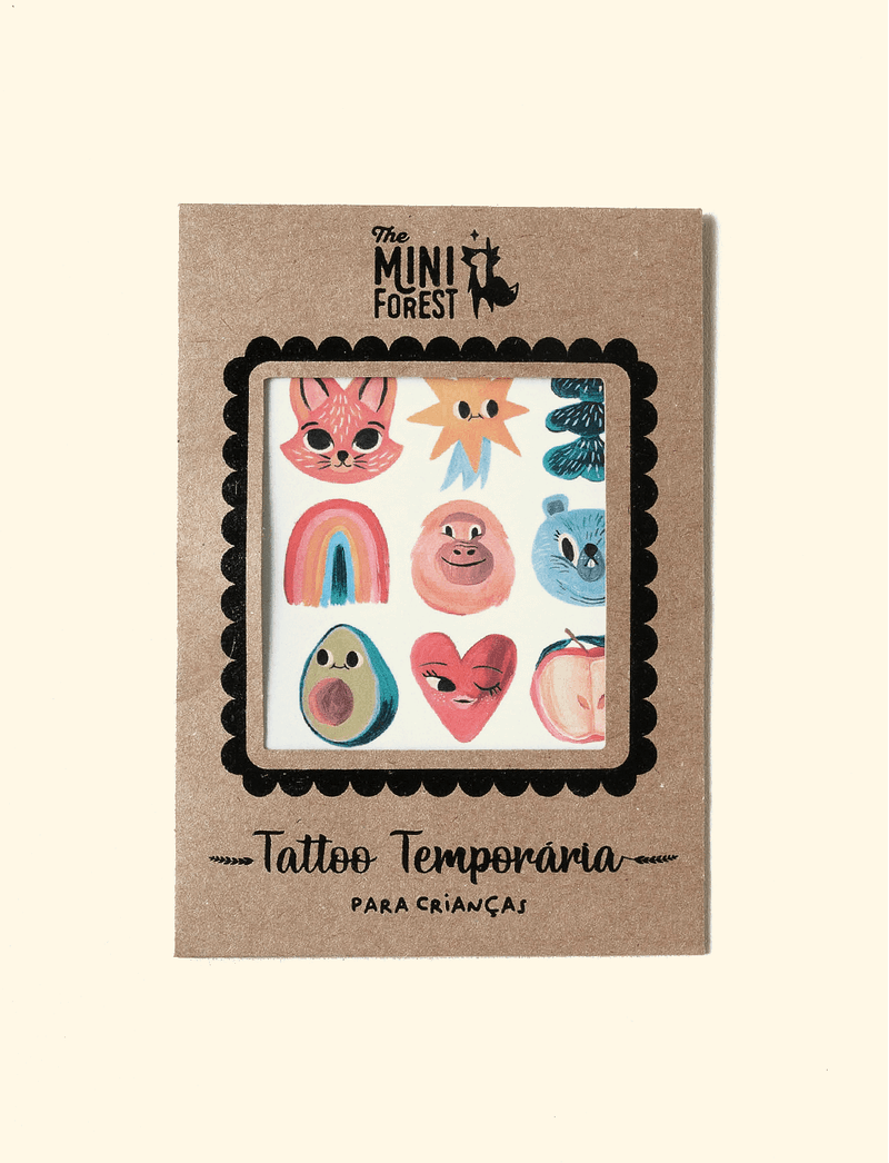 Cartela de tatuagens temporárias The Mini Forest, feita com tinta atóxica e com certificação do Inmetro. Prontos pra inspirar a brincadeira com crianças e adultos, a The Mini Forest traz os personagens e estampas mais amados da nossa florestinha para a pele de todo mundo! Composição: Papel e tinta atóxica, não testado em animais.(monocalke, goma e BOPP) Validade: 16/12/2026 Dimensão da cartela: 10cm X 15cm Instruções de aplicação: Retire a proteção plástica e aplique o desenho desejado sobre a pele limpa e seca. Jogue água pelo verso e não mova o papel. Retire após 30 segundos. É muito importante seguir o passo a passo e não se mover para que a tattoo fique perfeita. Para remover utilize álcool em gel. Obs.: * Como, ao cortar a cartela, produzimos partes pequenas, esse produto não é indicado para crianças menores de 3 anos sem supervisão de um adulto. * As medidas podem variar em 5%. *Lembramos que o pedido mínimo no site é de R$ 40,00.