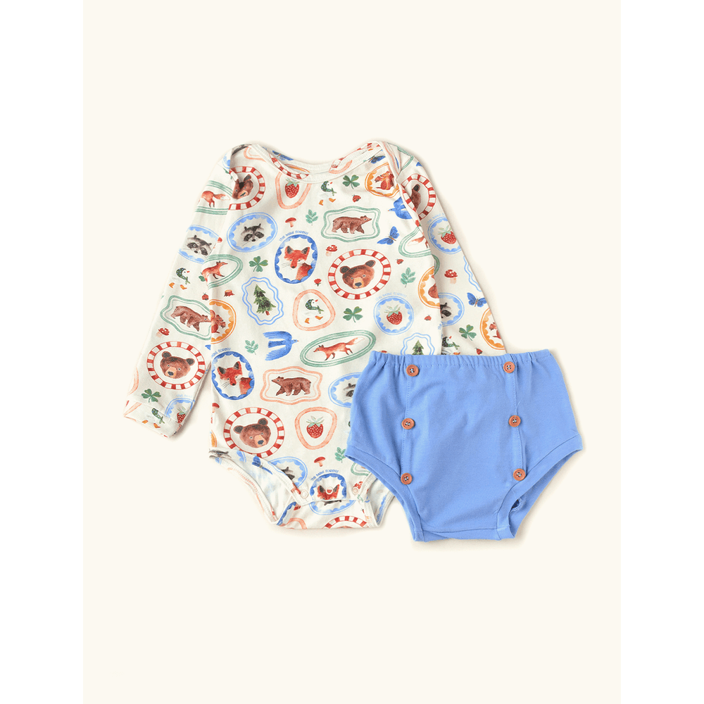 O tapa fralda tem botõezinhos decorativos e é feito em tecido liso, já o bodyzinho tem estampado os retratos dos bichinhos mais amados da floresta emoldurados.