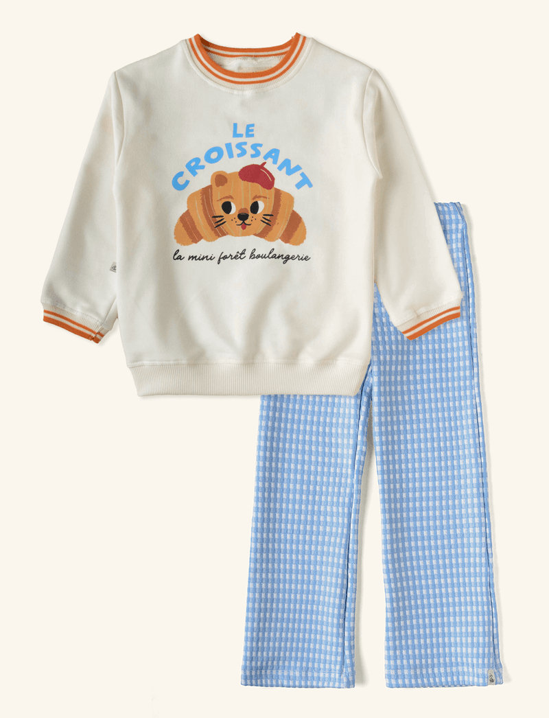 Nesse modelo, a The Mini Forest traz estampa vicky na calça e estampa na blusa, com um saboroso e simpático croissant.
