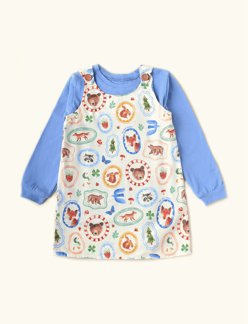 Conjuntinho infantil The Mini Forest composto por duas pecinhas, sendo uma a salopete (vestidinho) e a outra um body de manguinhas compridinhas. O vestido é feito em tecido plano de algodão, já o body é confeccionado em malha de algodão com elastano. A salopete é bem larguinha e tem fechamento em alcinhas com dois botõezinhos de encaixe.