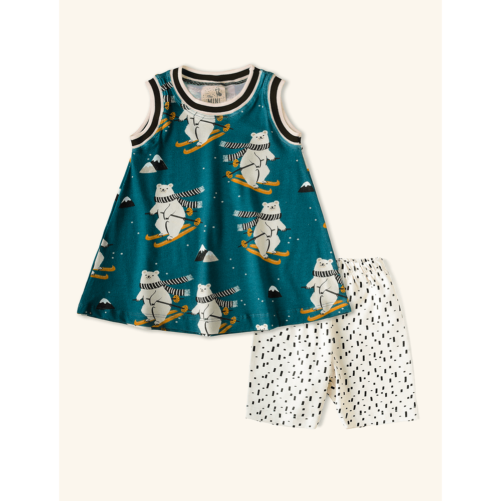 Conjunto infantil The Mini Forest de duas pecinhas, sendo uma delas bermuda ciclista e a outra um vestidinho bem curtinho.
