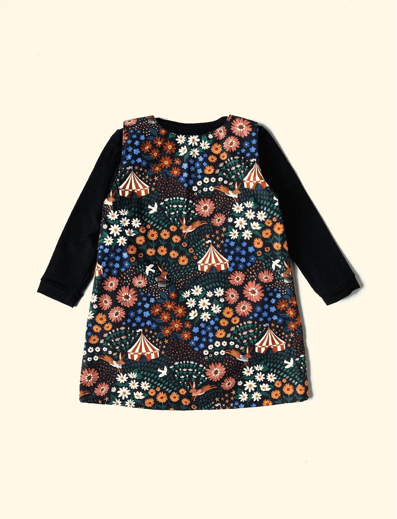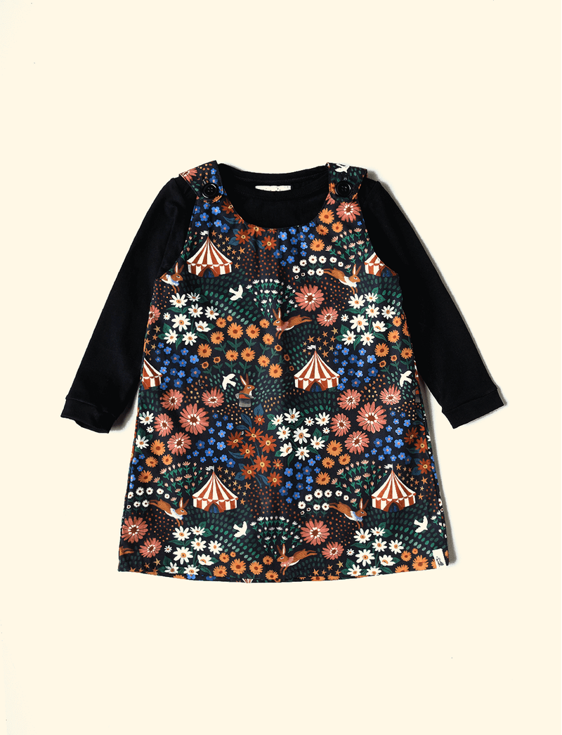 Conjuntinho infantil The Mini Forest composto por duas pecinhas, sendo uma a salopete (vestidinho) a outra body OU camiseta de manguinhas compridas. A salopete é feita em tecido plano de algodão e tem modelagem A, fica folgadinha e vai abrindo em direção ao barrado, além da estampa que traz a nossa floresta super florida, com animaizinhos correndo para um espetáculo que vai começar em breve na tenda que eles montaram no meio da nossa floresta!