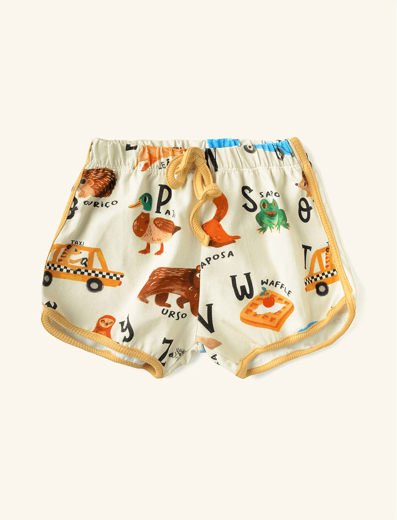A estampa vem cheia de letrinhas, incentivando a criançada a aprender todo o alfabeto junto aos bichinhos e frutinhas mais amados dos bosques da The mini Forest.