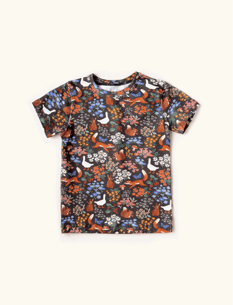 A estampa vem toda floridinha, com alguns animaizinhos silvestres passeando pelo jardim da The Mini Forest.