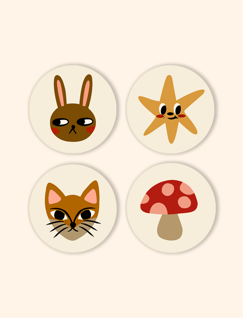 Nesse conjunto, a The Mini Forest trouxe quatro porta-copos com os mais fofos bichinhos da estampa cogumelo mágico: cogumelo,estrela,raposinha e coelho