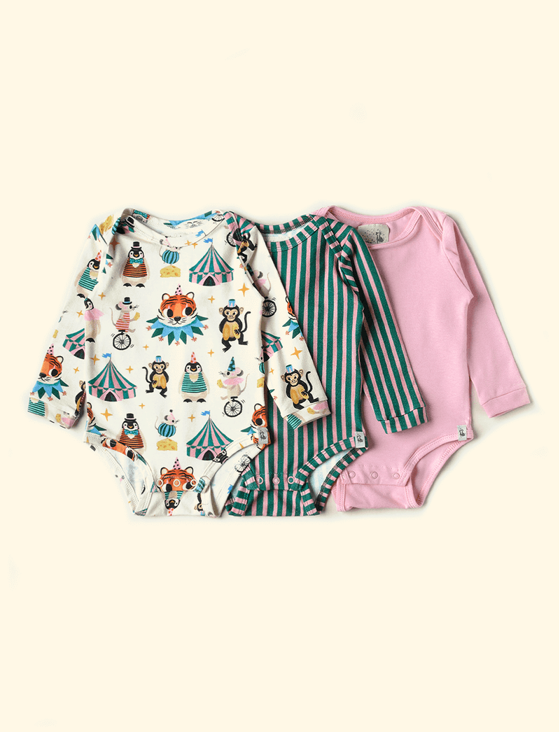 Kit The Mini Forest composto por três bodies de mangas curtinhas, sendo dois deles estampados e um liso.