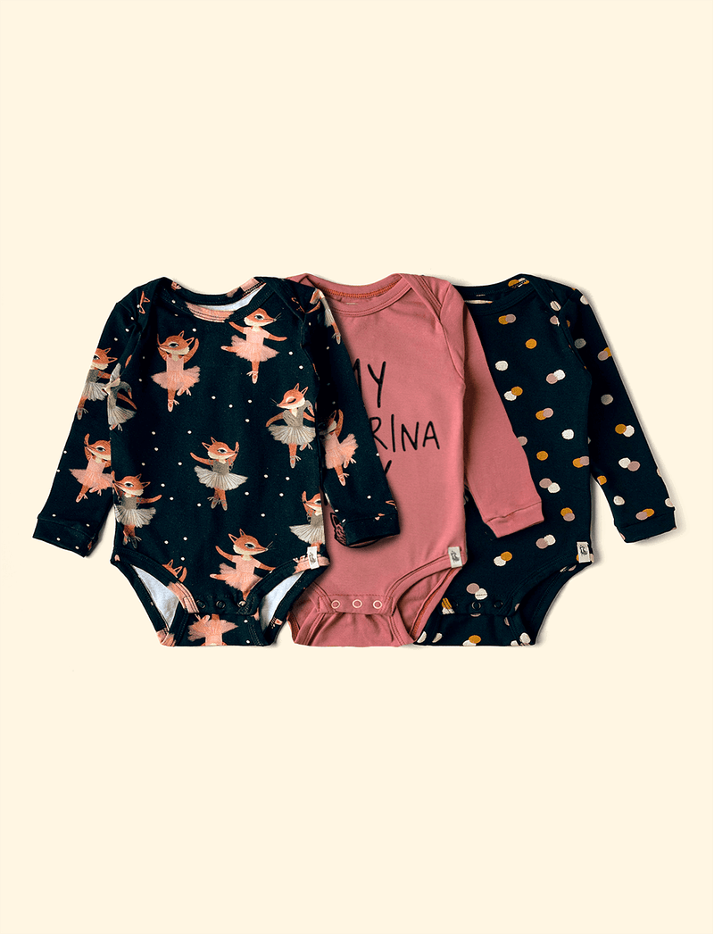 Kit The Mini Forest composto por três bodies de mangas curtinhas, sendo dois deles estampados e um liso. A peça lisa tem estampa localizada, uma delas tem estampa de bolinhas e a ultima tem a estampa das raposinhas bailarinas mais fofas da nossa floresta.