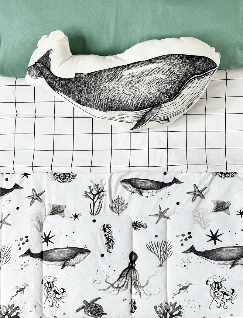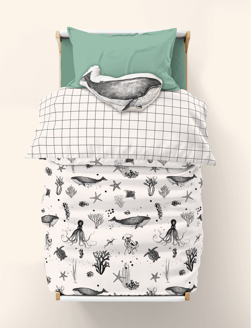 A Colcha é dupla face, feito em malha de algodão de ambos os lados, cada um com uma estampa exclusiva, sendo uma de xadrez grid e a outra é a Magia Marinha, que é super fofa, convidando os pequenos para uma aventura marinha, com vários bichinhos nadando no fundo do mar! Possui enchimento em manta acrílica de gramatura fina, que confere à peça maciez e garante que as noites de meia estação sejam quentinhas