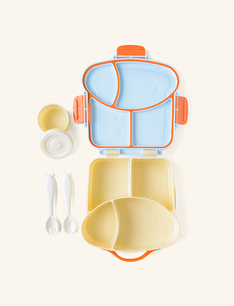 Já o Bento Box tem fechamento anti vazamento, com 4 divisões internas fixas, além de acompanhar um potinho avulso com 60ml e 2 talheres (1 colher e 1 garfinho).