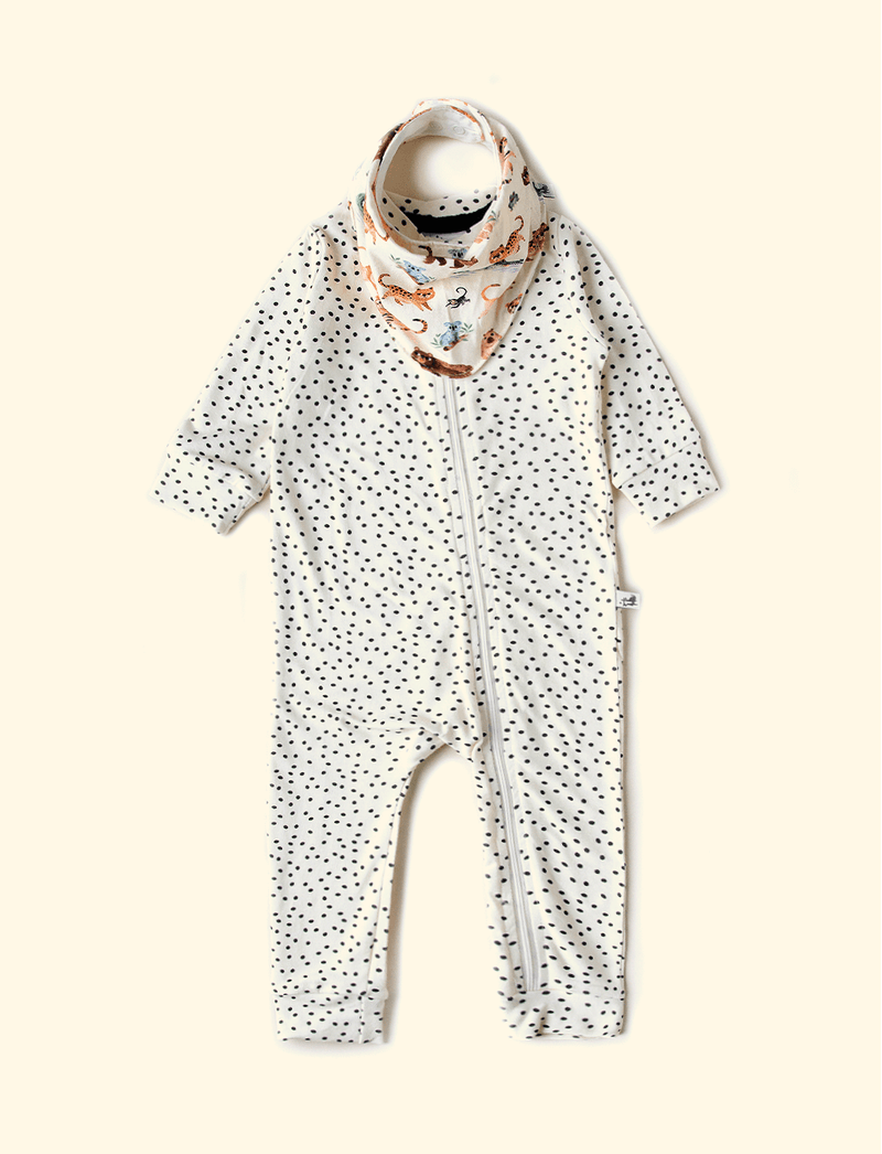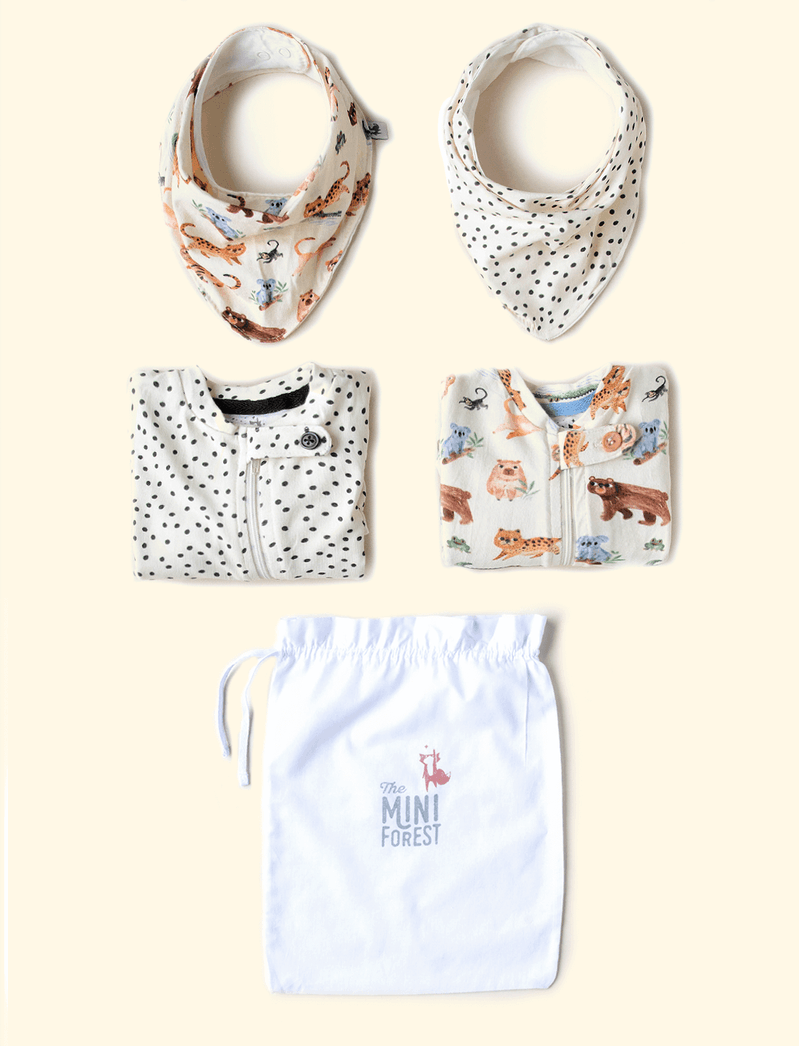 Kit de bebê The Mini Forest composto por dois macacões de fechamento frontal em zíper e dois babadores de modelagem de bandana. Um dos macacões e um dos babadores tem a estampa de bolinhas pretinhas, já o outro macacão e outro babador, representando a fauna de vários lugares do mundo, a estampa da The Mini Forest traz os bichinhos mais amados das florestas!