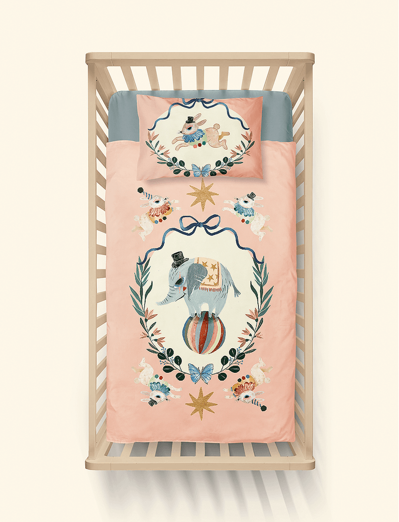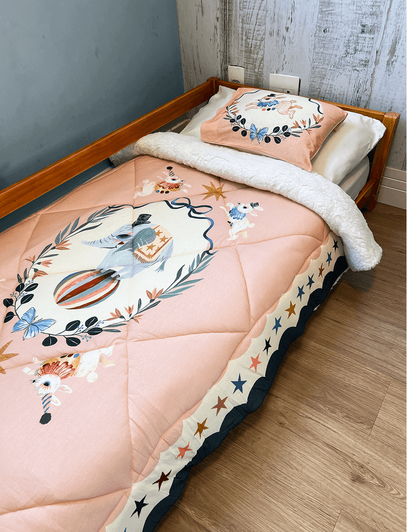 KIT Manta The Mini Forest composto por uma fronha estampada e Manta de Berço de espessura fina. A Manta é dupla face, com um lado estampado do elefante equilibrista mais meigo de toda a floresta e o outro de pelinho.