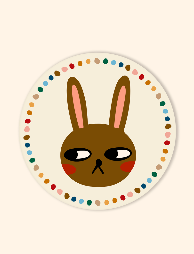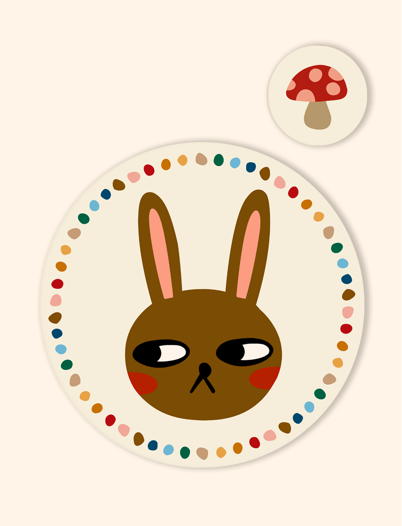Nesta estampa, a The Mini Forest traz o porta copos com cogumelo e o lugar americano com coelhinho e bolinhas coloridas
