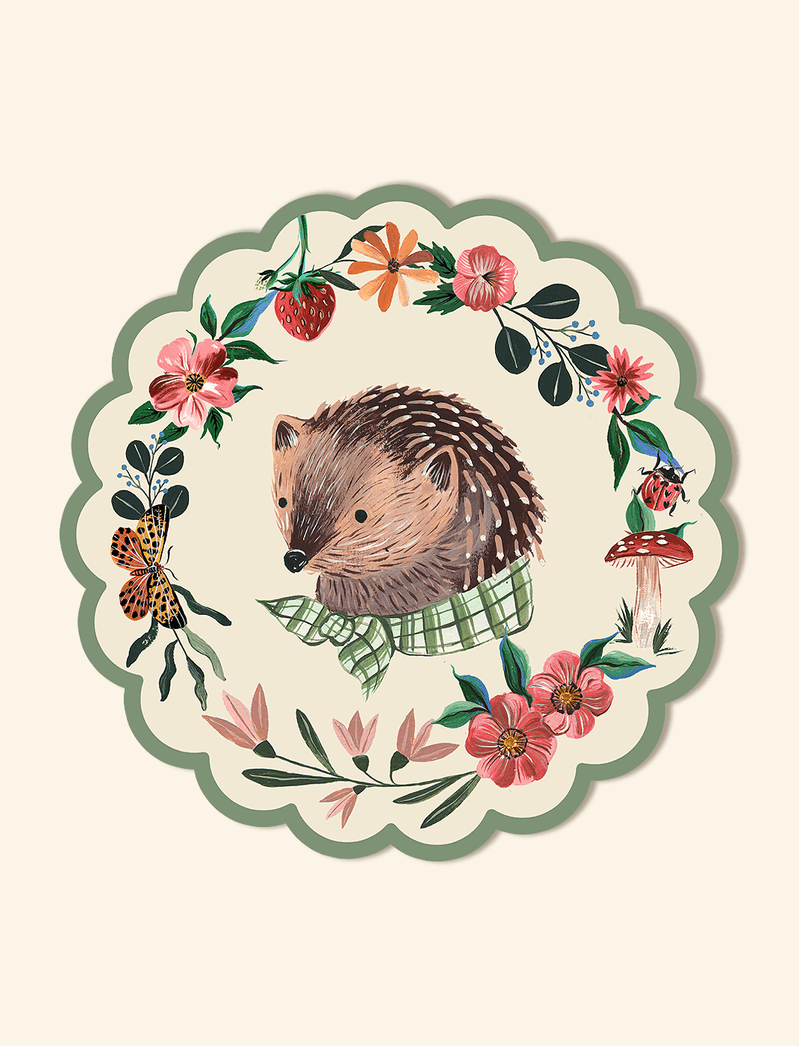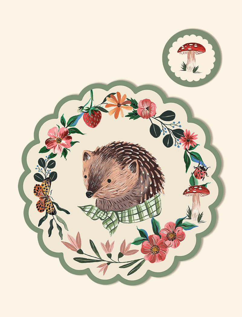 Nesta estampa, a The Mini Forest trouxe um lindo porco espinho com uma borda escalopada e um porta copos com estampa de cogumelo