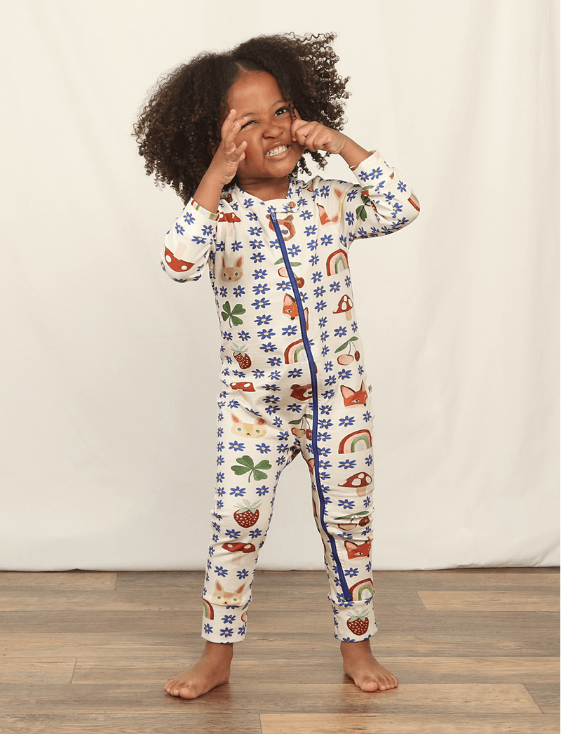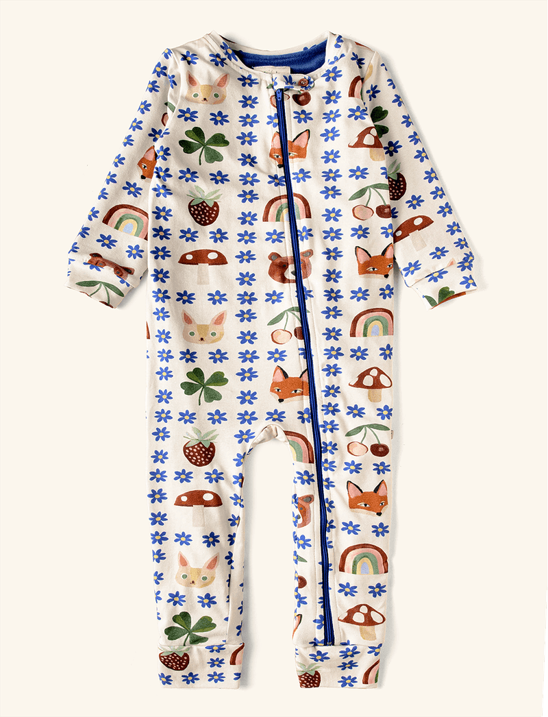 Nesse modelo, a The Mini Forest traz a estampa floridinha, com vários elementos que amamos: arco-íris, cerejinhas, urso, trevo, raposinhas, etc.