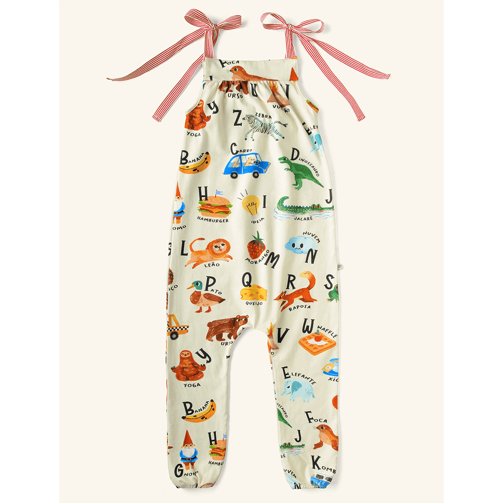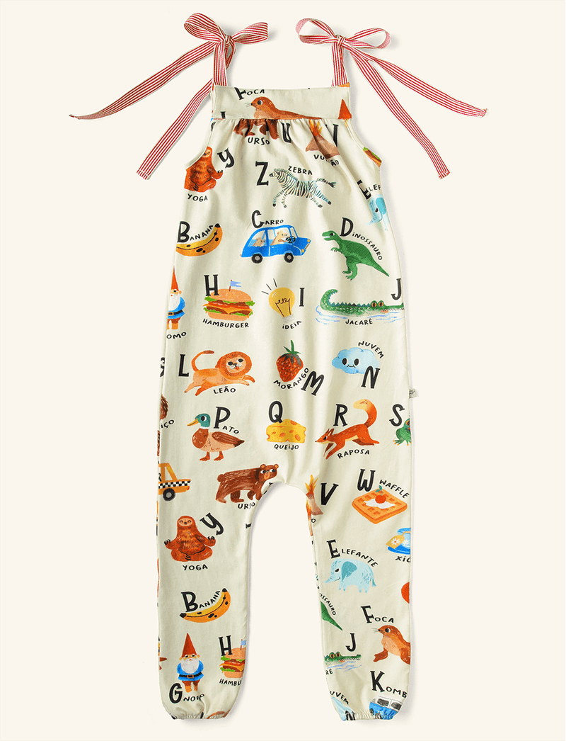 A estampa vem cheia de letrinhas, incentivando a criançada a aprender todo o alfabeto junto aos bichinhos e frutinhas mais amados dos bosques da The mini Forest.