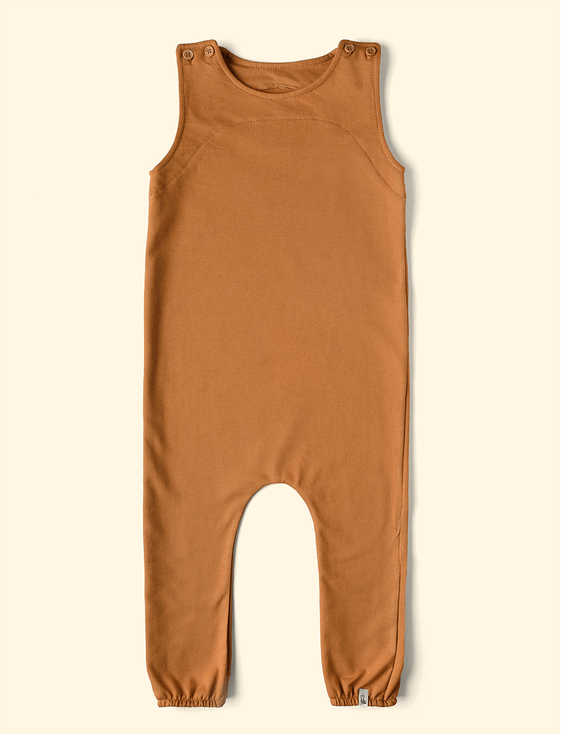 Macacão regata infantil unissex feito em moletinho de algodão, que dá uma armadinha na peça deixando o visual retrô. Tem fechamento em botõezinhos nos ombros, modelagem saruel e elástico ajustável na barra.