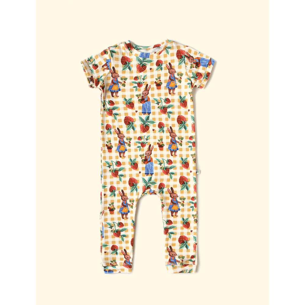 Nesse modelo, a The Mini Forest traz o fundo xadrez que é pura delicadeza, com vários coelhinhos colhendo morangos.