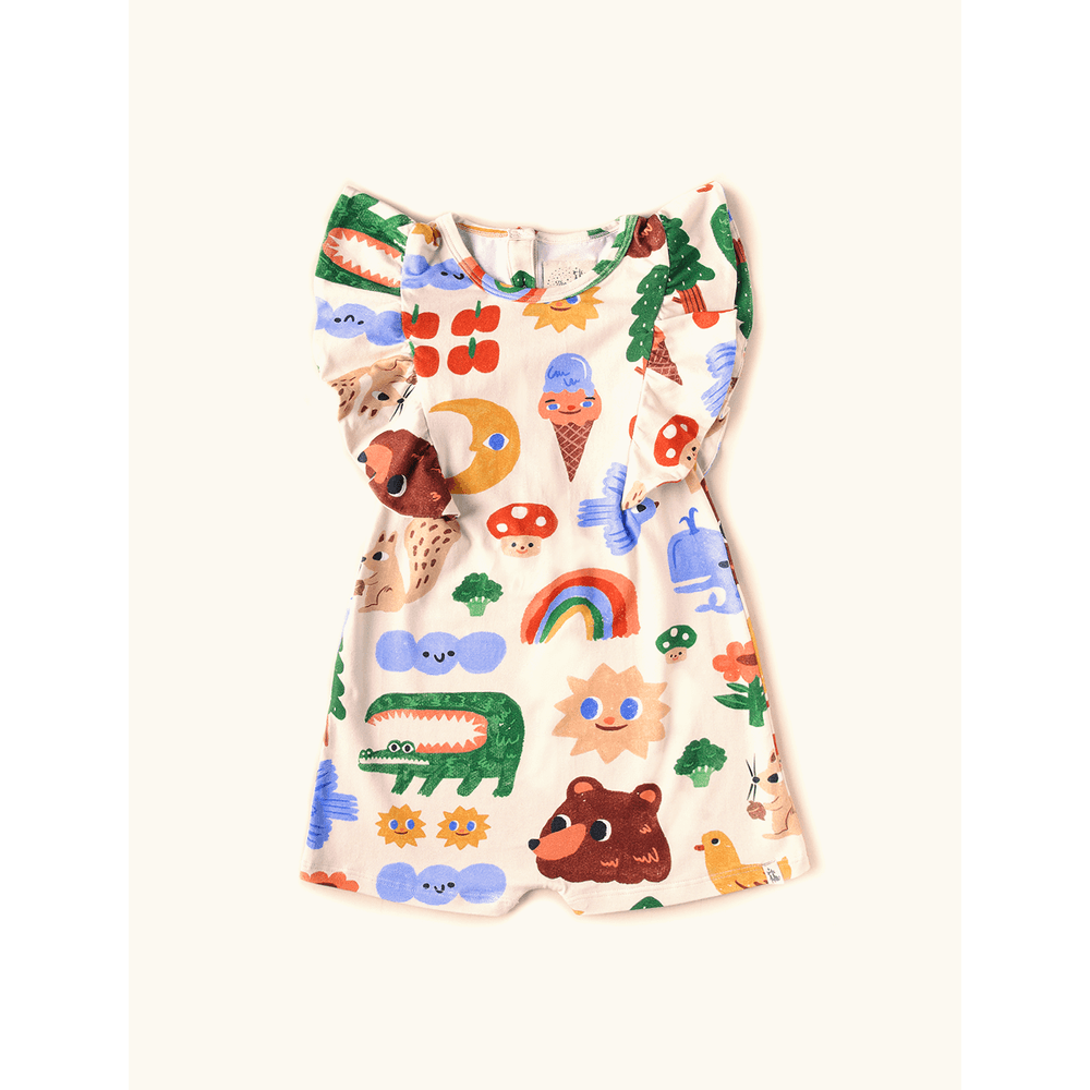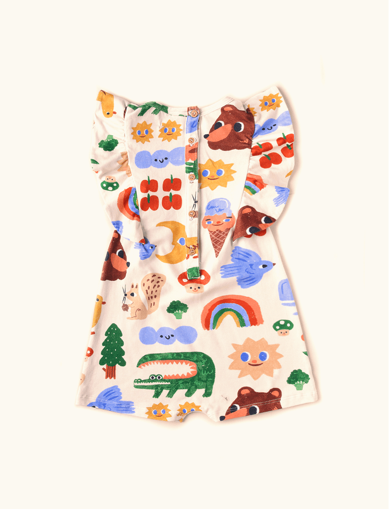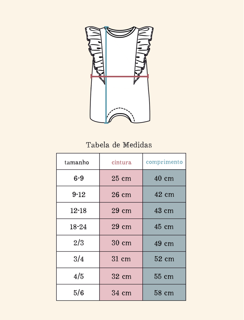 Macaquinho The Mini Forest de modelagem saruel e sem mangas, confeccionado em malha de algodão com elastano, que além de confortável, tem toque macio e elasticidade. Tem fechamento feito por botões de encaixe nas costas, além de aplicação de babado na vertical, partindo da cintura, passando pelos ombros e finalizando nas costas.