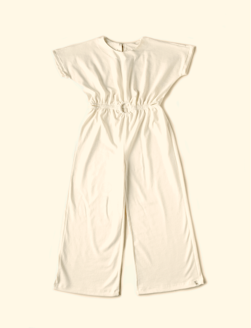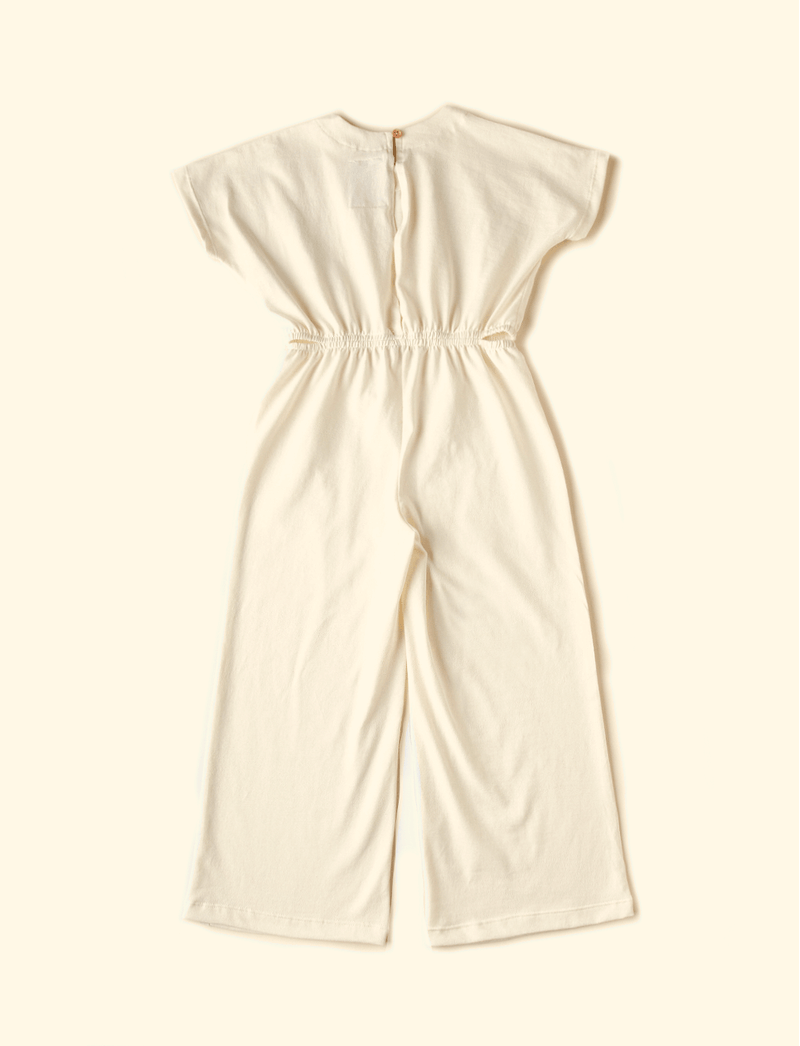 Macacão infantil The Mini Forest com manguinhas curtas, feito em meia-malha de algodão, que é super levinho e fluido, não limitando o movimento das meninas durante das brincadeiras. Tem recorte na cintura e modelagem de calça wideleg.