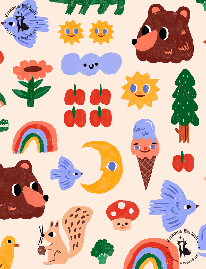Tem a estampa super alto astral, com rostinho de animaizinhos da floresta, frutinhas e outros símbolos muito amados pela criançada, como sorvetes, arco-íris e cogumelos.