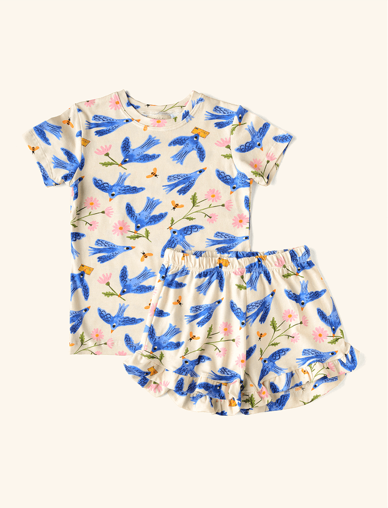 Pijama infantil Unissex The Mini Forest composto por short e camiseta de mangas curtas. O conjunto é feito em malha super macia e leve de algodão, que é confortável, fresco e tem a maleabilidade ideal para acompanhar as horas de sono da criançada. Tem elástico na cintura, babadinhos na barra do short e acabamento em viés .