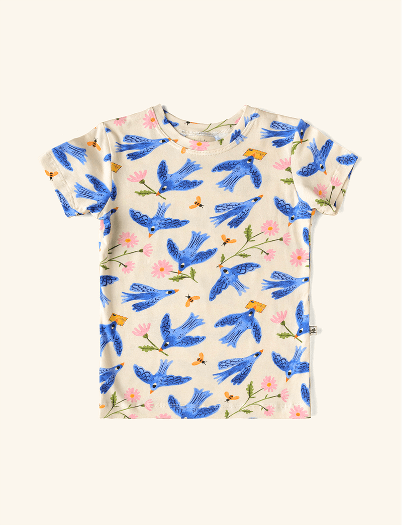 Nessa estampa, a The Mini Forest traz o céu colorido pelo voo do bando de andorinhas azuis.
