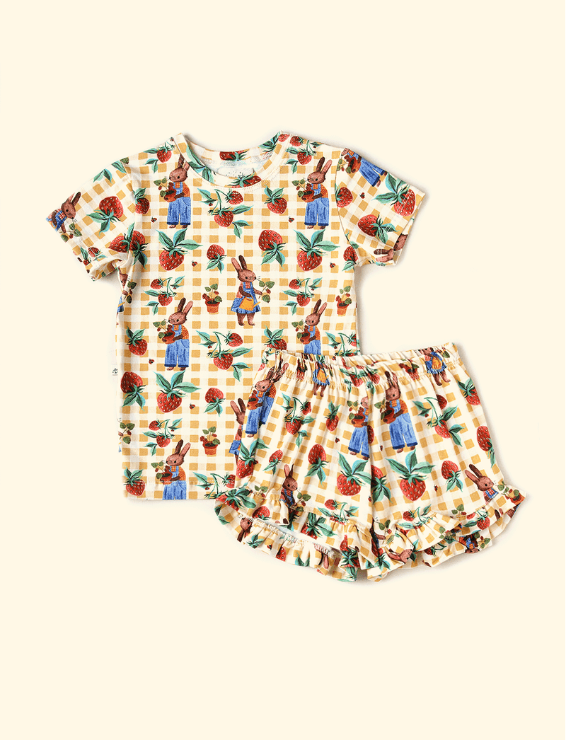 Nesse modelo, a The Mini Forest traz o fundo xadrez que é pura delicadeza, com vários coelhinhos colhendo morangos.