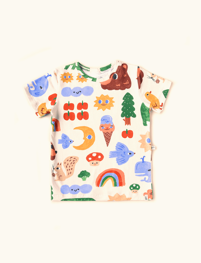 Tem a estampa super alto astral, com rostinho de animaizinhos da floresta, frutinhas e outros símbolos muito amados pela criançada, como sorvetes, arco-íris e cogumelos.