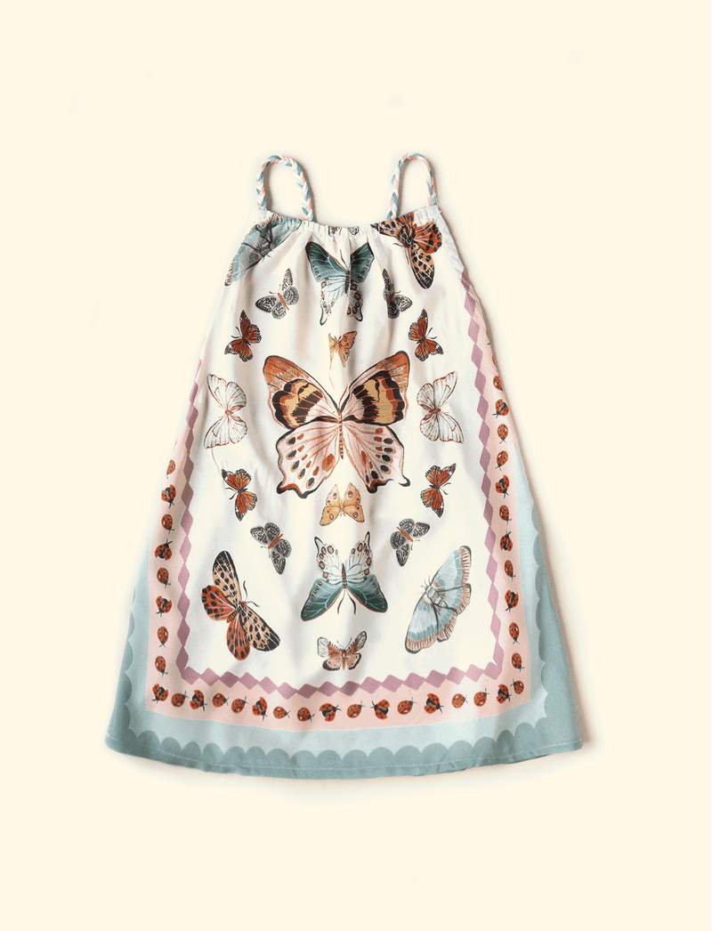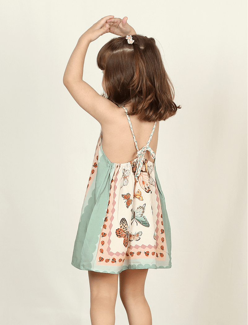 Vestido Infantil Alça Trançada Borboletas e Joaninhas Baunilha