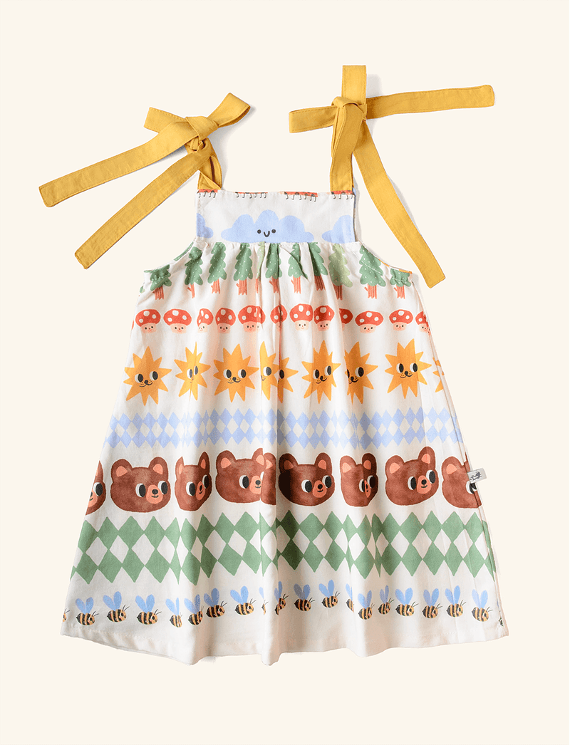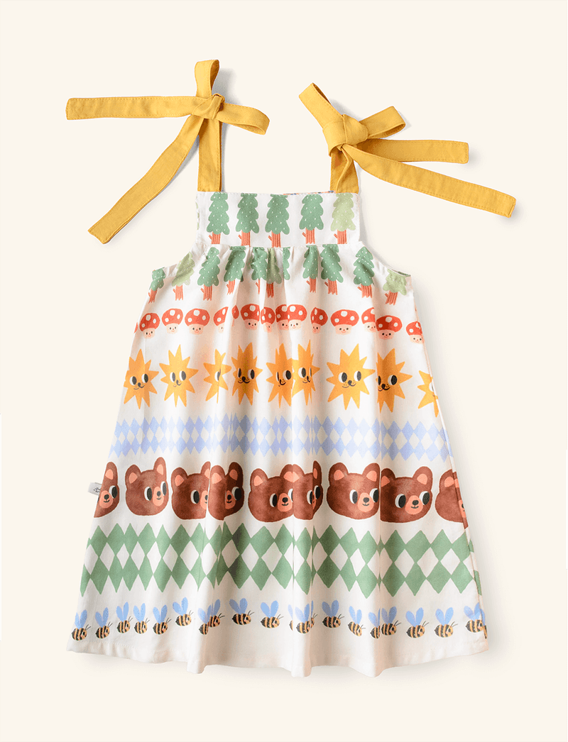 Vestido infantil The Mini Forest com modelagem larguinha e ajuste feito por amarração nas alcinhas, que vai alargando ao longo do comprimento. É confeccionado em tecido plano de algodão, que garante que a pele dos pequenos transpire livremente, não atrapalhando nas brincadeiras e permitindo que eles fiquem o mais fresquinhos possível.