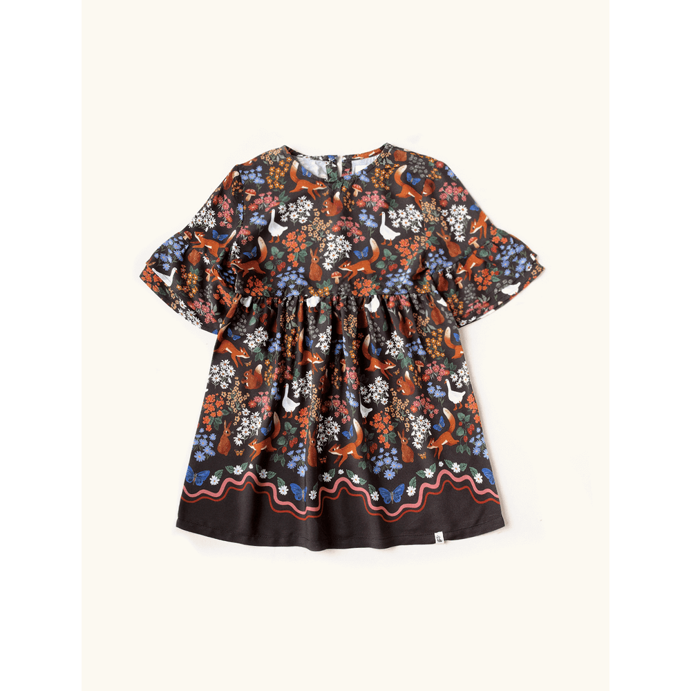 Vestidinho The Mini Forest feito em tecido plano de viscose de madeira de reflorestamento (certificada) que, além de muito leve, maleável e fresquinha, não agride o meio ambiente. Esse modelo tem meia-manga com babado e fechamento em botões nas costas, que facilita a hora de vestir os pequenos