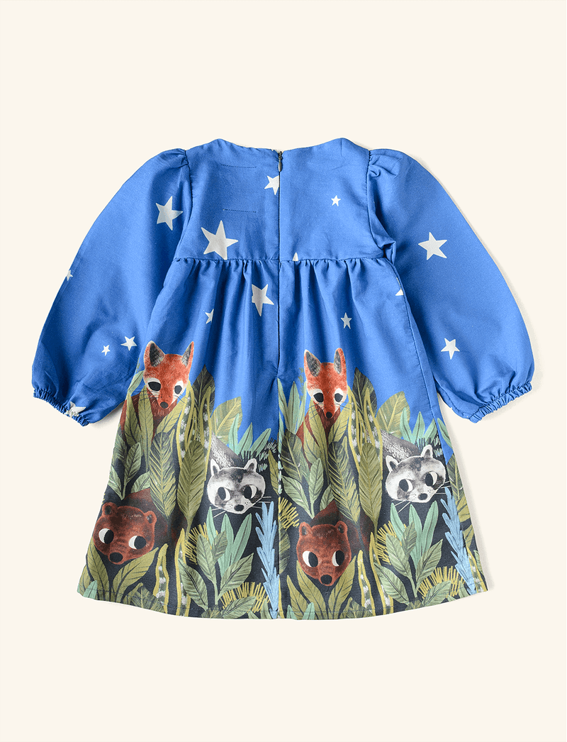 Nesta estampa, a The Mini Forest traz a raposa, o guaxinim e o urso reunidos sob um Céu Azul cheio de estrelinhas, brincando juntos na floresta.