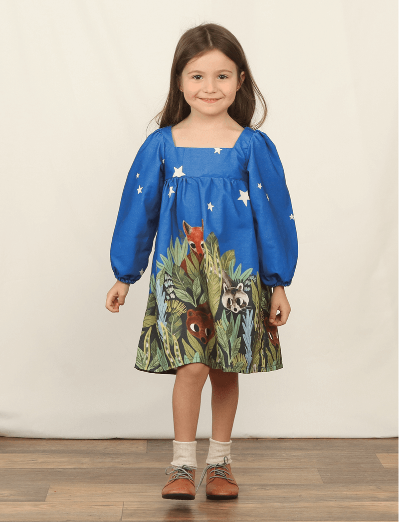 Vestido infantil The Mini Forest com as manguinhas longas bufante e decote quadrado. É confeccionado em tecido plano de algodão, que garante que a pele dos pequenos transpire livremente, não atrapalhando nas brincadeiras.