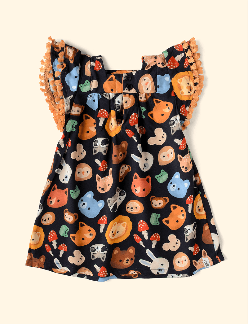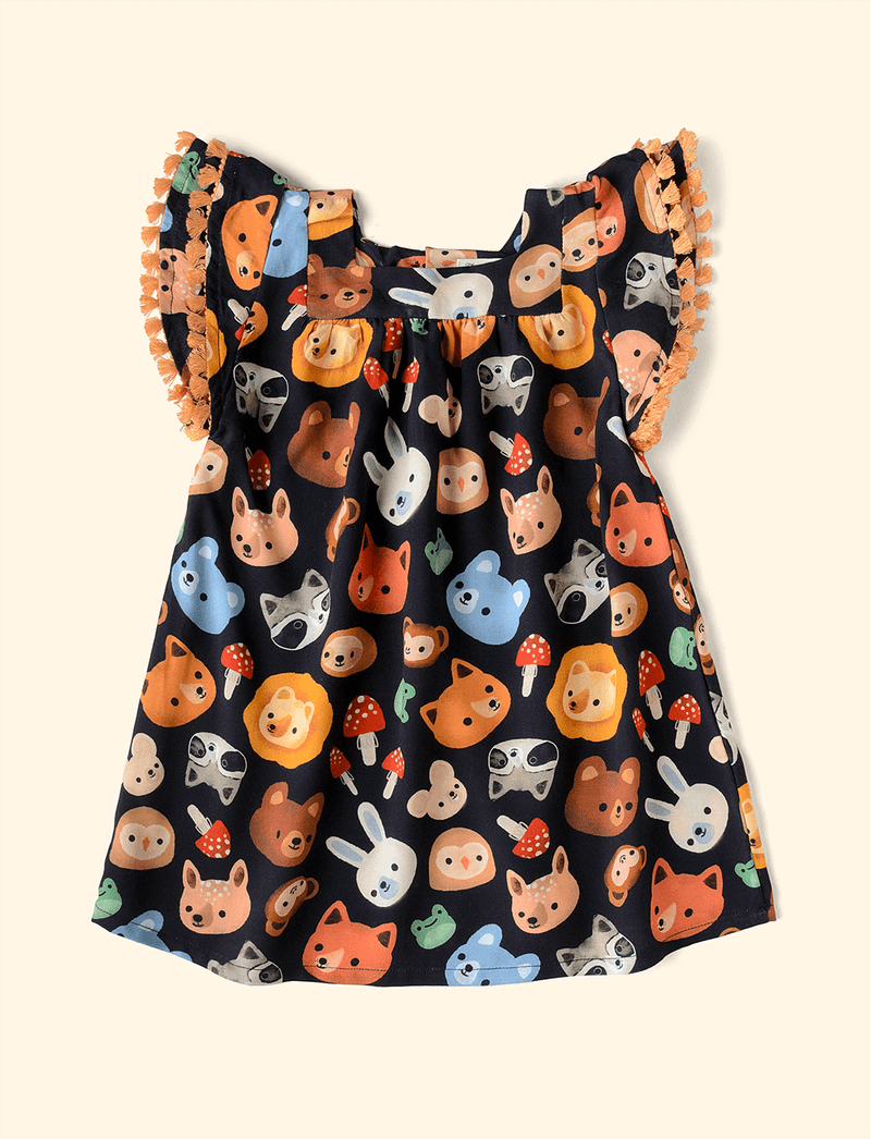 Vestido Infantil Manga Dupla Máscaras da Fauna Preto