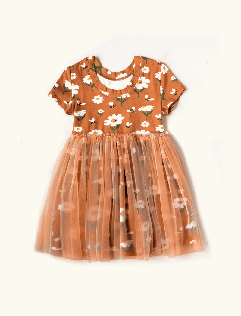 Vestido infantil The Mini Forest com as manguinhas curtas e decote redondo. Essa pecinha é feita em malha de algodão, que é macia e respirável, que deixa as crianças super confortáveis. Esse modelinho tem aplicação de sainha de tule por cima da peça estampada, parecendo um tutu de bailarina, que além de ser puro charme é muito amada pelas crianças.