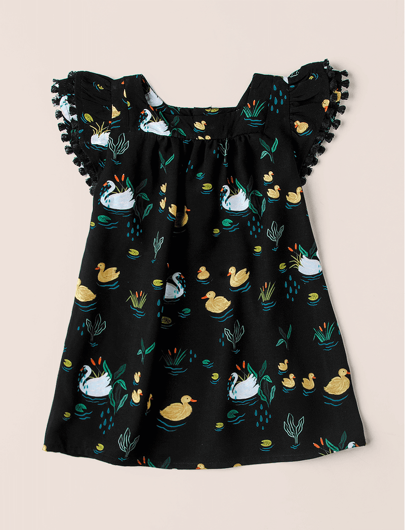 Vestido The Mini Forest confeccionado em tecido plano de viscose de madeira de reflorestamento (certificada) que, além de muito leve, maleável e fresquinha, não agride o meio ambiente. Tem modelagem soltinha, decote quadrado e aplicação de pompom nas manguinhas.
