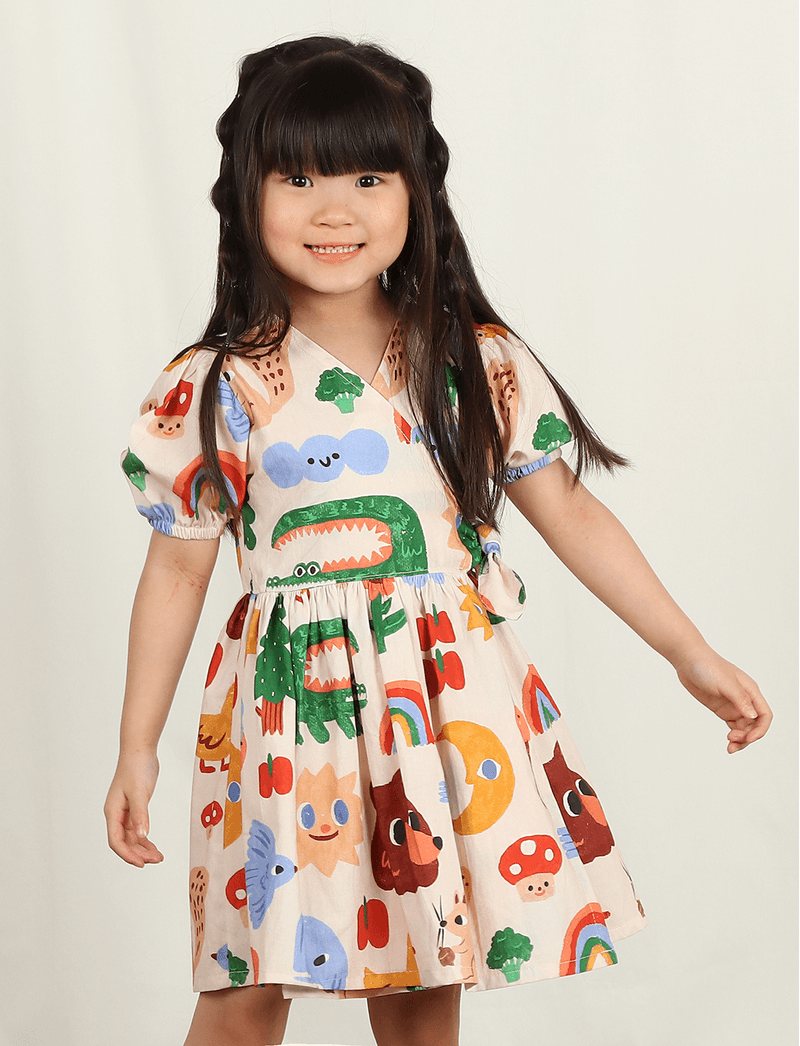 Vestido The Mini Forest confeccionado em tecido plano de algodão, que é muito fresquinho e garante que as crianças transpirem livremente sem causar danos à pele. Tem modelagem acinturada, com transpasse de decote e nózinho na lateral da cintura, além de manguinhas curtas.